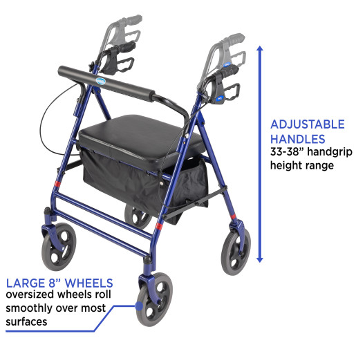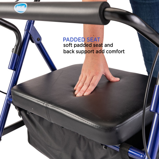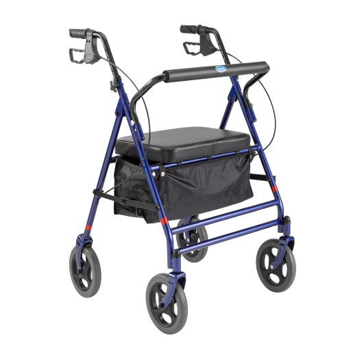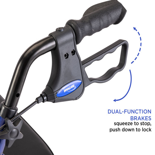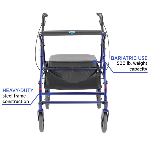 The Invacare Bariatric Rollator features a durable steel frame and 8" wheels for smooth mobility. A flip-up, padded seat and removable backrest provide a place to sit down when needed and are easily out of the way when desired. Easy-to-use handbrakes help provide stability and peace-of-mind.