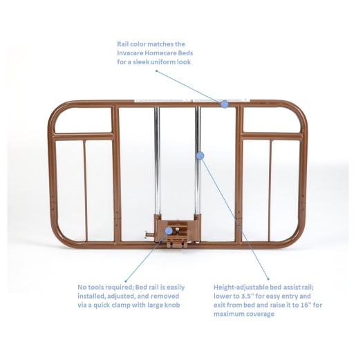The Invacare Clamp-On Half Length Rail is designed to secure quickly and easily, ultimately reducing the time spent during set-up. The design of this half rail meets FDA entrapment guidance and features compact storage without cumbersome crossbraces.